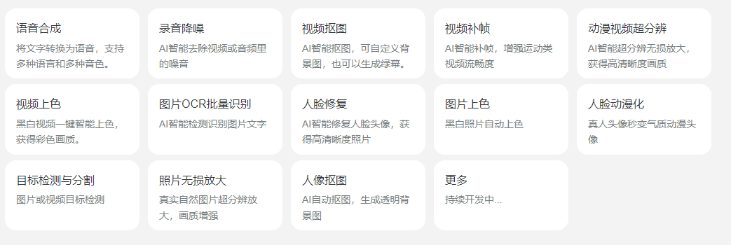 这个叫小白兔 AI 的工具箱一共包含视频超分、音频降噪、人像抠图、人脸修复等十几种工具。